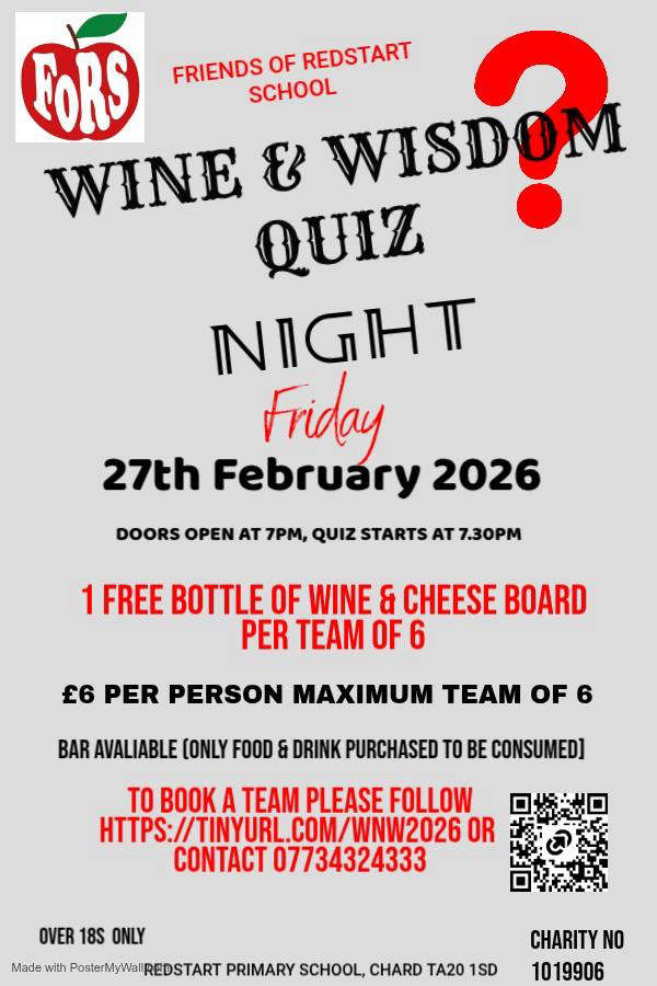 Friends of Redstart School in Chard present the Wine & Wisdom Night on Friday 27th February 2026.